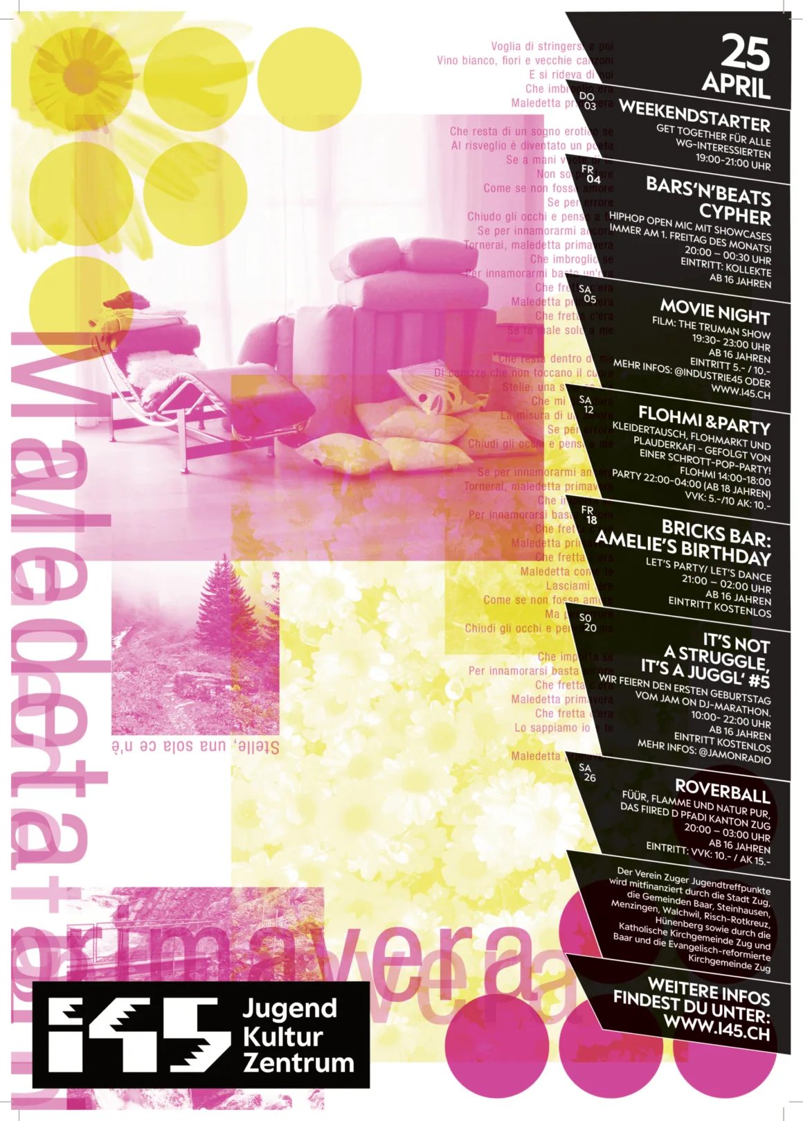 Wir bieten einem jungen (Gestaltungs-)Talent eine Plattform, das im Grafikbereich Fuss fassen will. Bist du nicht älter als 30 Jahre und kommst du aus dem Raum Zug? Willst du für ein Jahr das Monatsplakat der i45 gestalten? Dann bewirb dich jetzt!