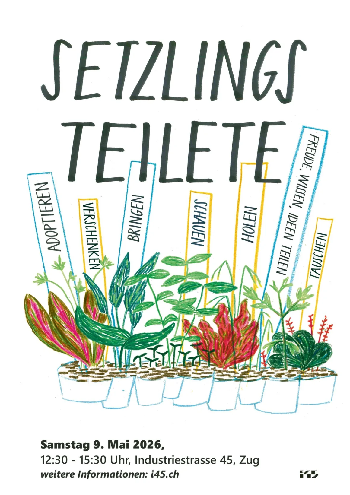 Du kannst deine Setzlinge und andere Utensilien am Samstag 9. Mai von 12:30 – 15:30 Uhr in der i45 vorbeibringen und dich an der Setzlingsteilete bedienen. Zudem ist es auch möglich vorab am Freitag 8. Mai von 14:00 – 18:00 Uhr deine Setzlinge oder anderes in der i45 abzugeben.