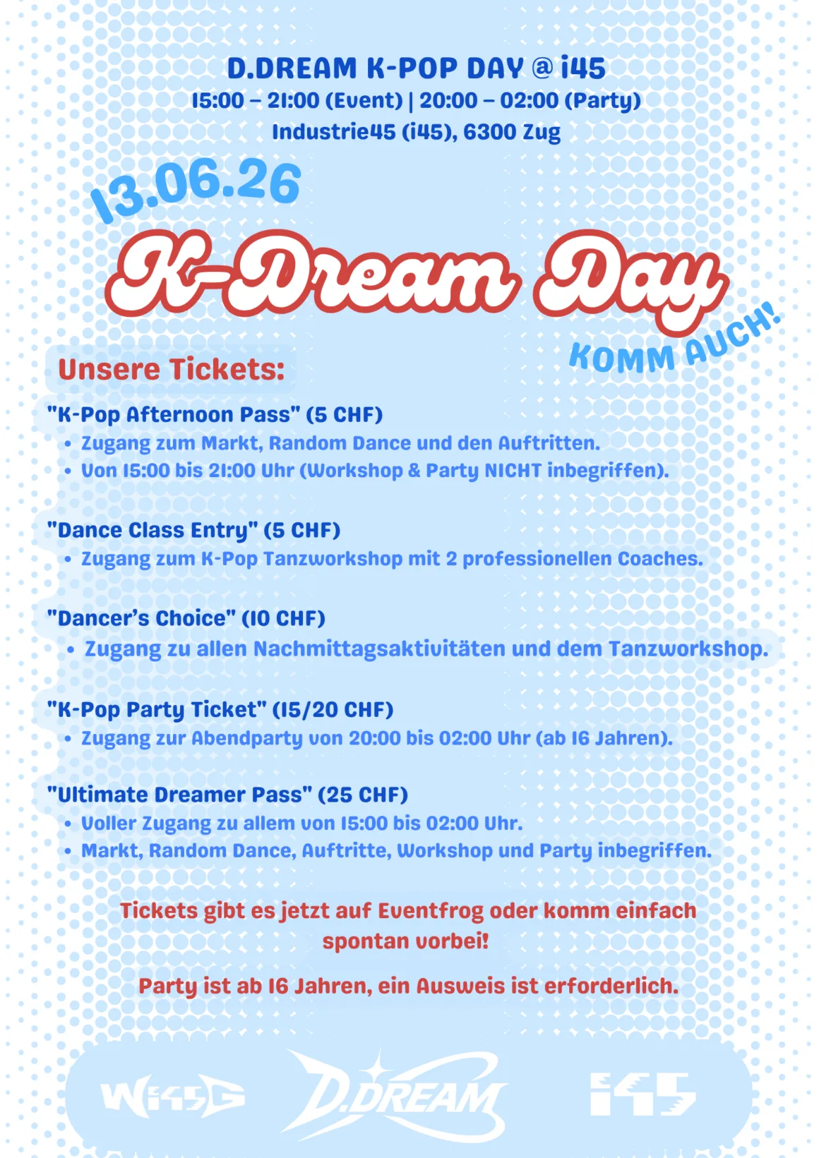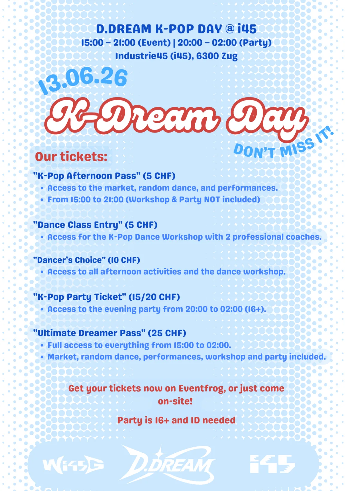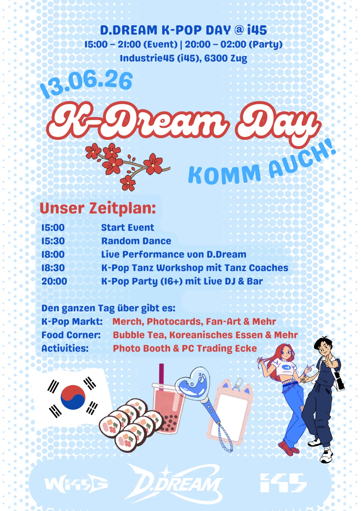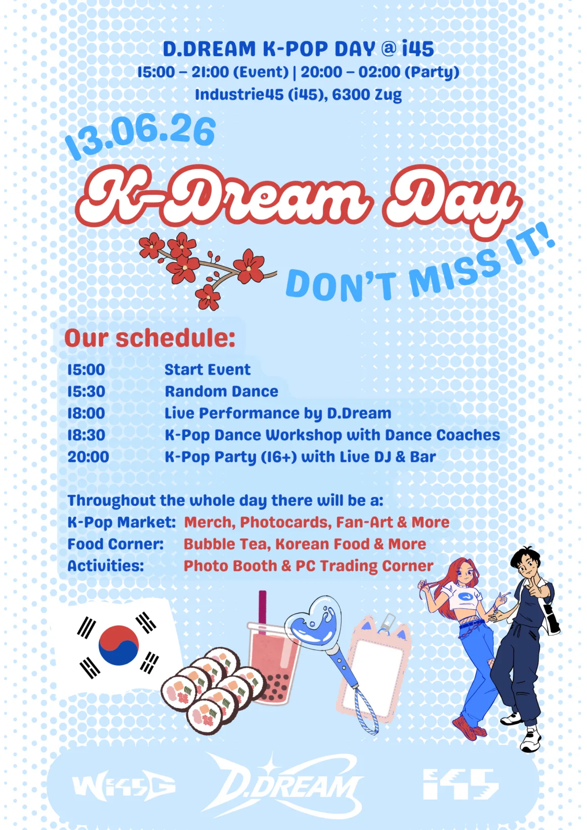 Erlebe unsere energiegeladene Party, geniesse leckeres koreanisches Essen und erfrischende Drinks und nimm an einem spannenden Tanz-Workshop teil. Als besonderes Highlight präsentieren wir die exklusive Tanzaufführung der neuen Gruppe D.Dream aus Zug – sei unter den Ersten, die sie live erleben!